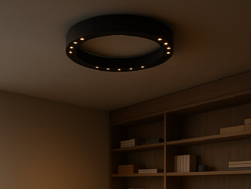 מנורה צמודת תקרה MONOLUX היא מנורת תקרה טבעתית בצבע שחור עמוק, המשלבת גוף אלומיניום מינימליסטי עם נקודות אור שקועות סביב ההיקף. האור החם הנשפך מטה יוצר הילה רכה ומדויקת, בעוד הצורה הגרפית של הטבעת מעניקה לתקרה מראה אדריכלי חד וברור.