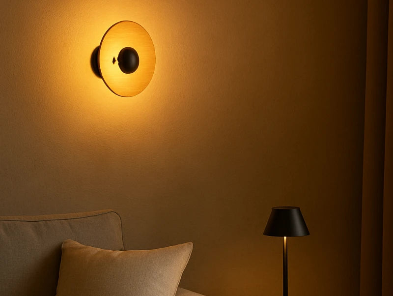 השילוב בין אלומיניום שחור לגרעין עץ טבעי יוצר קונטרסט מאוזן בין מודרניות לחומריות חמה. המקור הנסתר מאחורי הדיסק מונע סנוור ומאפשר תאורה עקיפה מושלמת, כזו שמתאימה לחללי מגורים, מסדרונות וחדרי שינה כאחד.
