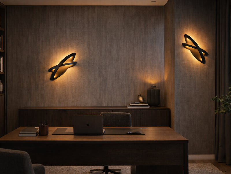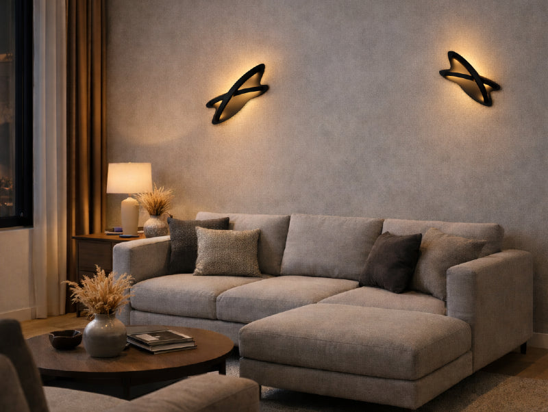 תאורת ה־LED משולבת לאורך הקו המתעקל ומפזרת אור חם בגוון 3000K. הניגוד בין הגוף השחור לאור הרך יוצר משחק מדויק של אור וצל ומעניק לקיר אופי מודרני ומעודן.