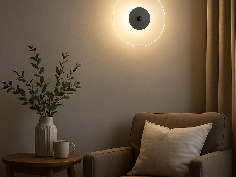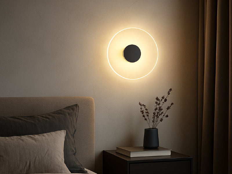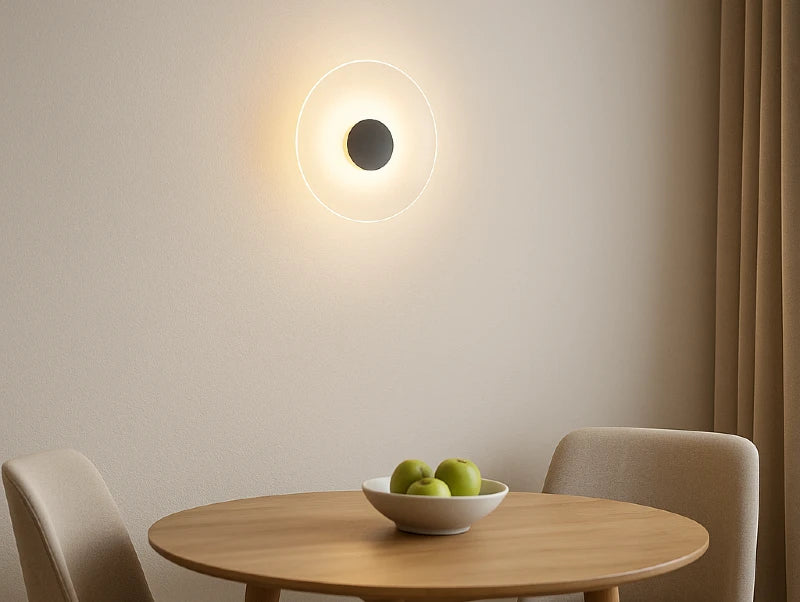 בין הדגמים, KORO בולטת כמנורת קיר בעיצוב עגול עם גימור כרום ומרכז כהה מט, המשולבת באור היקפי רך בגוון 3000K. המבנה הדקיק בעובי 12 מ"מ בלבד מעניק תחושת אור מרחפת, והופך אותה לאידאלית למסדרונות, חדרי שינה או קירות דקורטיביים הזקוקים למגע של יוקרה שקטה.