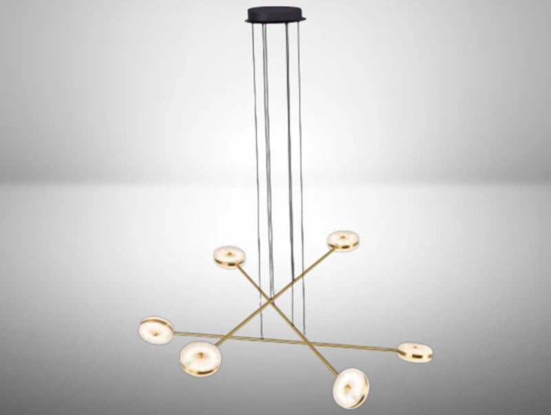 מנורת תלייה BALANÇA Cross בנויה מזרועות פליז דקות המצטלבות סביב מרכז אחד, ועל קצותיהן נקודות אור מזכוכית שמרחפות בחלל. הקווים נקיים, הגיאומטריה חדה, והנוכחות מרגישה אדריכלית — גוף תאורה שמייצר אמירה ברורה בלי להעמיס.