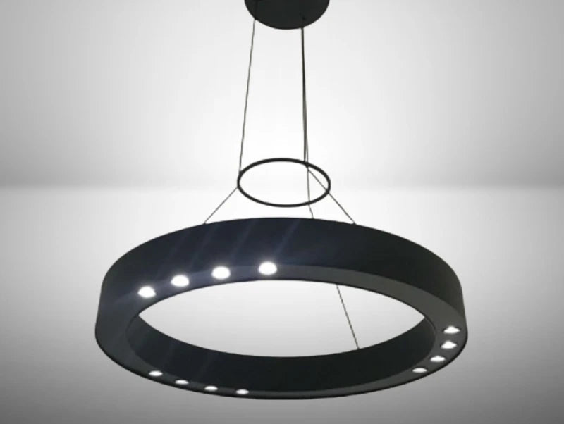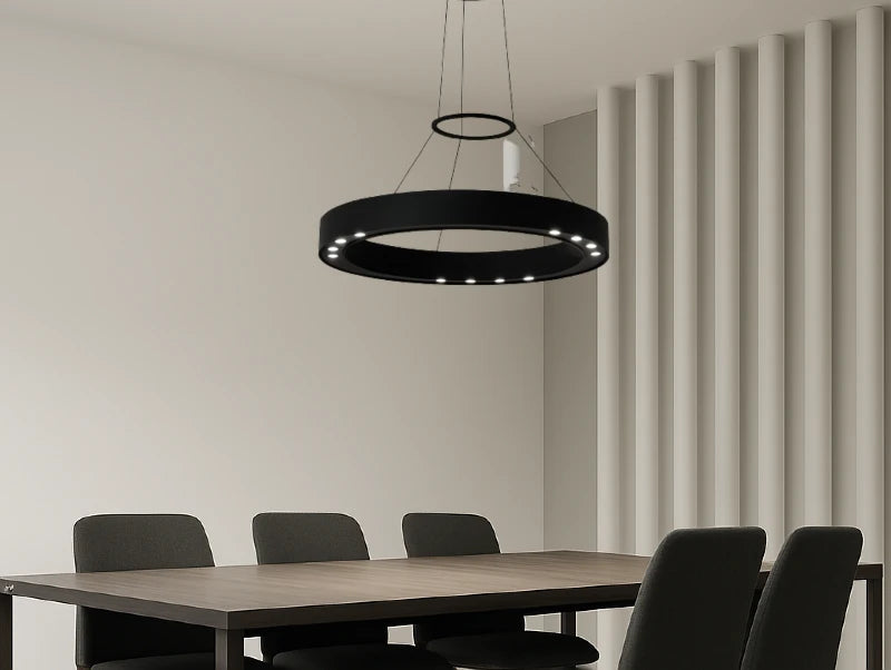 מנורת התלייה CIRKÉ בנויה כטבעת עבה ומינימליסטית שתלויה בעדינות מעל החלל, ומפזרת אור נקי סביב שולחן או אזור ישיבה. נקודות האור הפונות כלפי מטה יוצרות תחושה של טבעת מוארת שמרחפת באוויר ולא רק "עוד גוף תאורה".