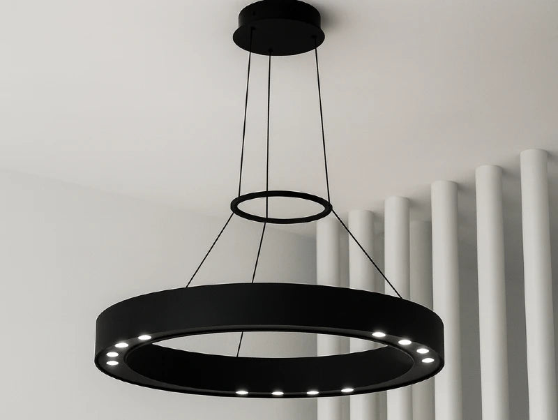 גוף האלומיניום הטבעתי, הכבלים הדקים והחיבור העליון הקומפקטי יוצרים מראה מרחף שמגדיר את מרכז החלל. האור היקפי, המופץ מתוך הטבעת עצמה, מדגיש משטחים וחומרים מתחתיה ומוסיף עומק ואווירה גם כאשר המנורה כבויה.