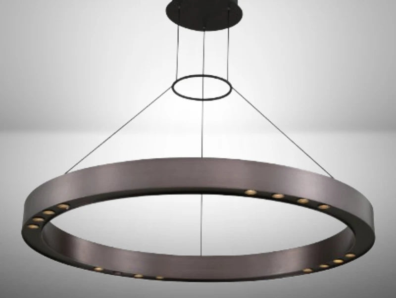 גוף האלומיניום הטבעתי, הכבלים הדקים והחיבור העליון הקומפקטי יוצרים מראה מרחף שמגדיר את מרכז החלל. האור ההיקפי, היוצא מתוך הטבעת עצמה, מדגיש משטחים וחומרים מתחתיה ומוסיף עומק ואווירה גם כאשר המנורה כבויה.
