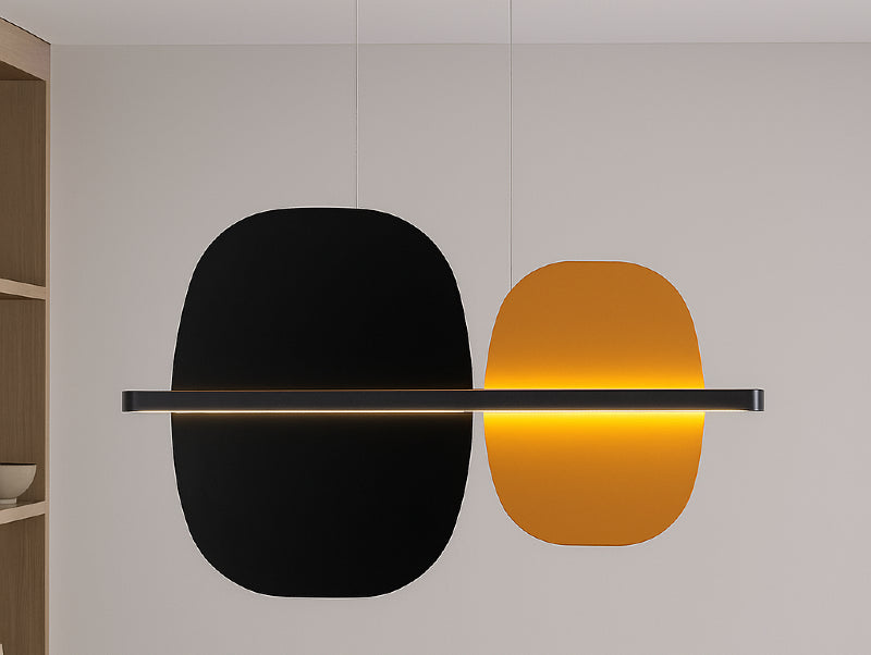 מנורת תלייה DUET Art זו יצירה מודרנית שמרחפת בחלל ומייצרת שילוב מהפנט בין שני אלמנטים צבעוניים: שחור וזהב. קונטרסט שמשלב יוקרה, אומנות ונוכחות חמה שמעצימה כל חדר.