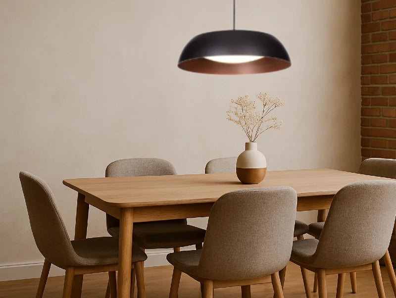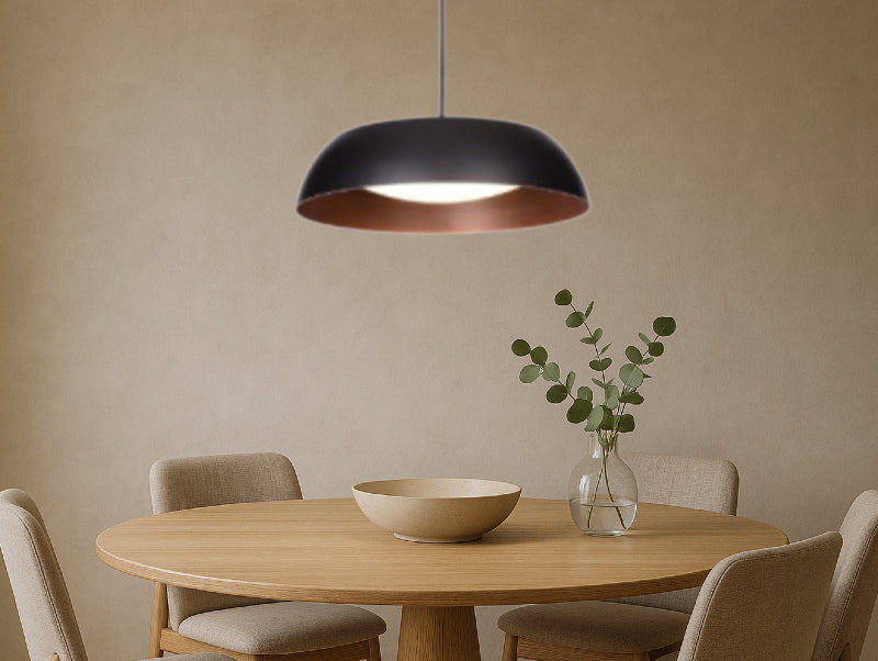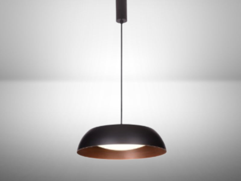 מנורת תלייה MELIA, אלגנטית בעלת גוף שחור מט ופרופיל מעוגל, עם פנים בגוון נחושת חם היוצר זוהר יוקרתי ומעודן.