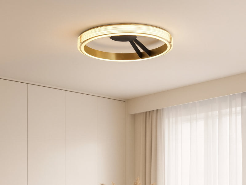 - טבעת תקרה זהובה בעיצוב מעוגל ודק שמעניק לחלל מראה יוקרתי ומעודן.